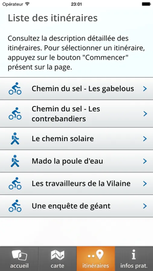 Choisissez un itinéraire, validez votre choix grâce au bouton "commencer" et rendez-vous sur le départ !
