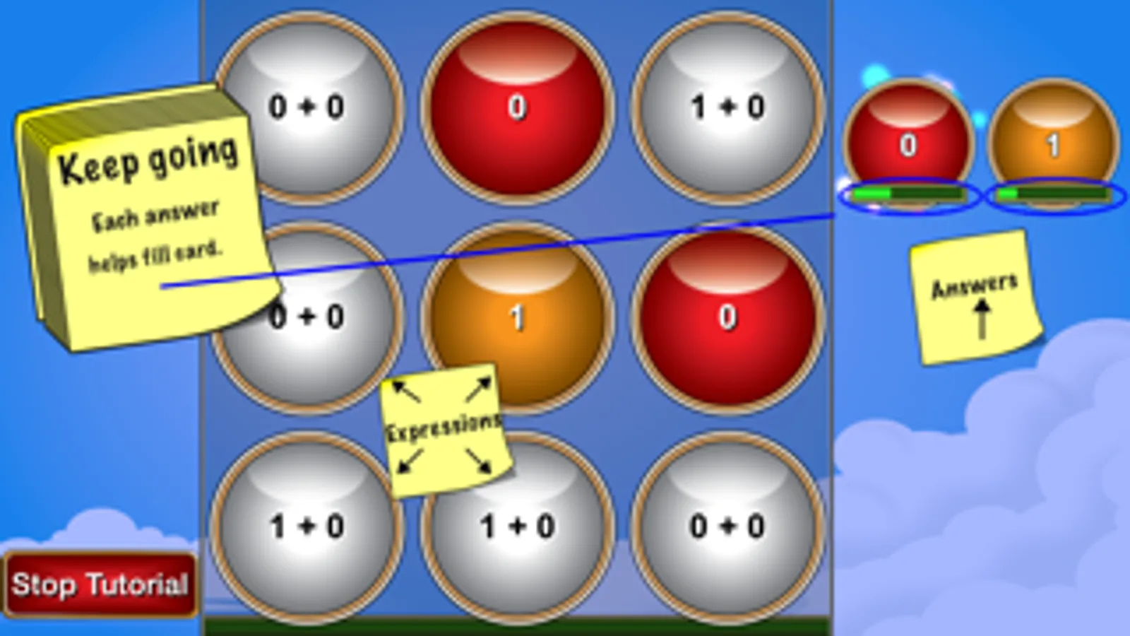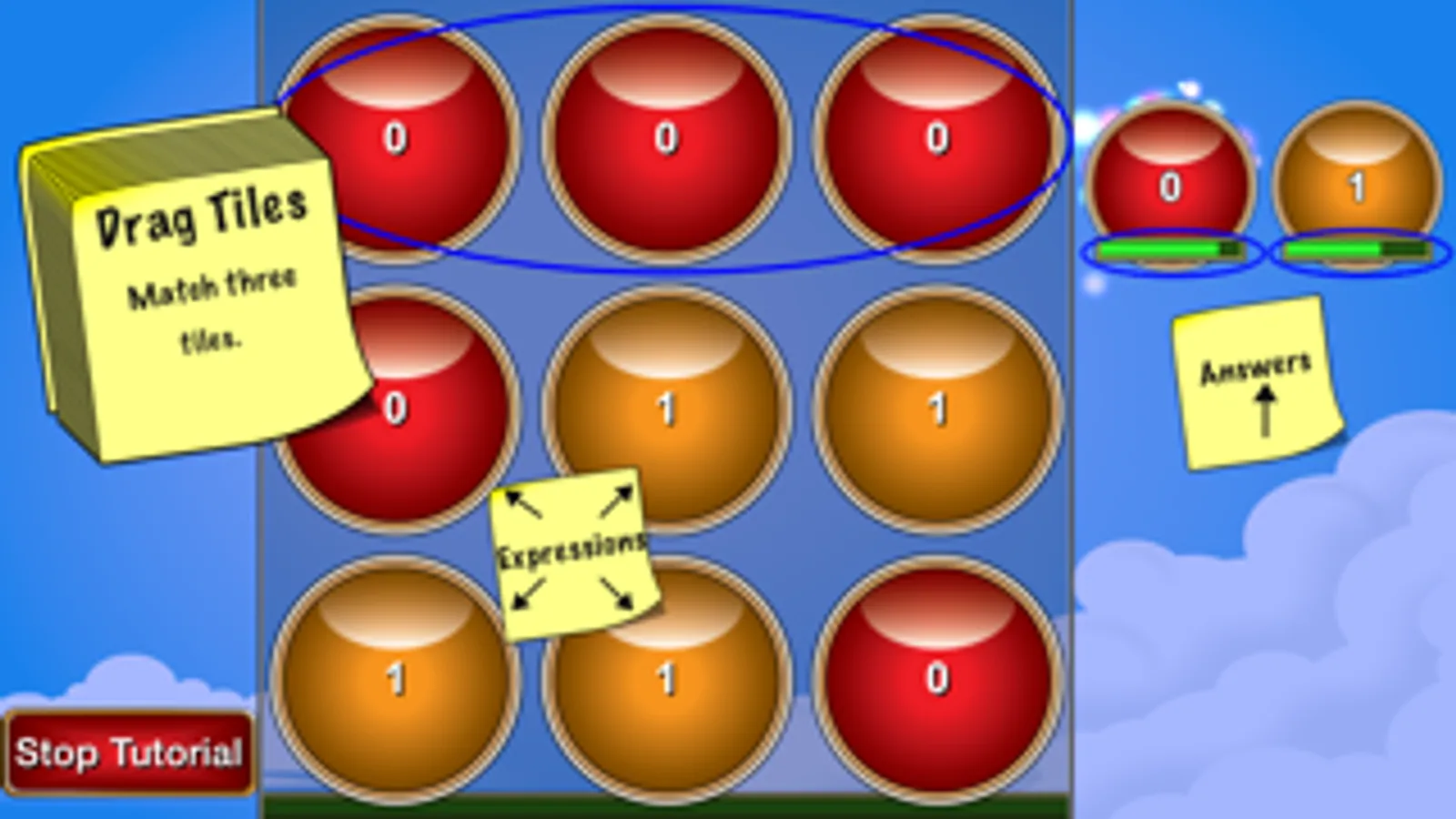 Stamp math expressions with colorful answer tiles. Solve a tile-matching puzzle to advance. Earn stars and trophies as you get faster at recognizing equivalencies.