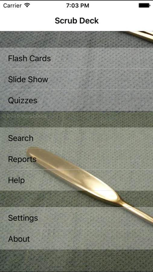 ScrubDeck™ offers 250 clear and in-color instrument flashcards in 12 surgical services: general, laparoscopic, OB/GYN, genitourinary, thoracic, vascular, ortho, arthoscopic, neuro, eyes, ENT and plastics. Personalize your ScrubDeck™ with notes and custom names. Test your recall with the quizzes "Name That Instrument" and "Find That Instrument." Keep track of your progress with "Reports." ScrubDeck™ also has a customizable Slideshow, searchable index, and data export feature.