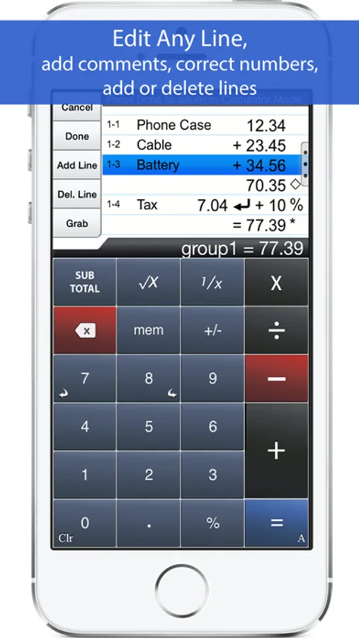 A4. Touch any line of the paper tape to go into edit mode. Touch Add or Delete Line. You can also edit numbers, and split Add/Sub or Mul/Div groups. Press Done to return to Calculator mode