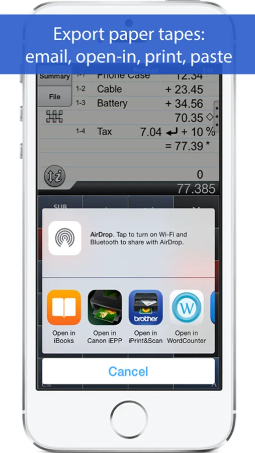 A5. From the Export dialog, select from: Email, Print, Copy or Open-In. Email includes a pdf attachment. Print requires an AirPrint capable printer. Open-In will cause a menu of 3rd party Apps to appear that can receive a hardcopy of your paper tape; for example, iBooks, DropBox, and 3rd party printer Apps for Brother, HP, Epson, Canon and more. With these print directly to a network reachable printer (even if it is NOT AirPrint capable).