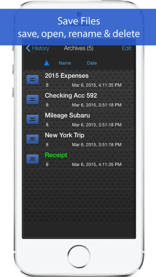 Save & retrieve important paper tape files for later use. Review & edit numbers, add or delete lines. You can also export paper tape files to iBooks©, DropBox©, Email or your favorite printing utility (see the FAQs).