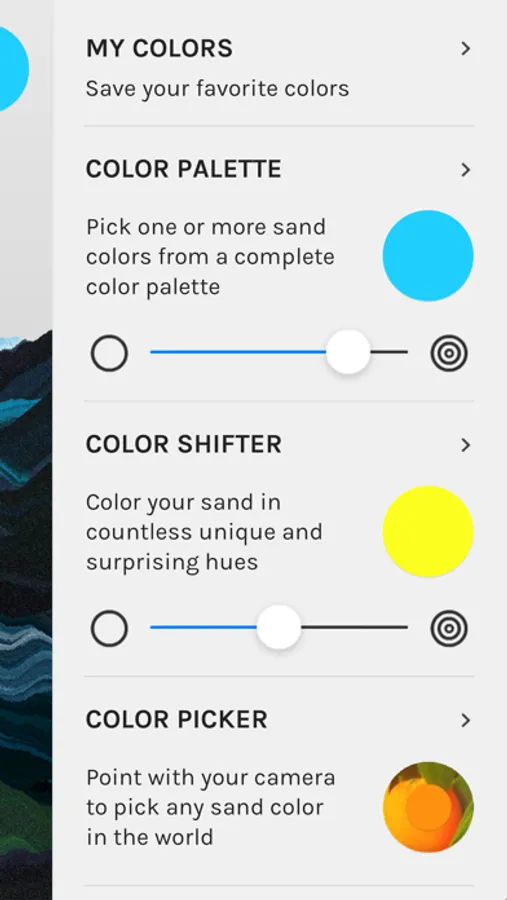 MY COLORS: Save your favorite colors in My Colors and access them quickly by long pressing the color button on the sand canvas. Try saving colors from around with Color Picker!