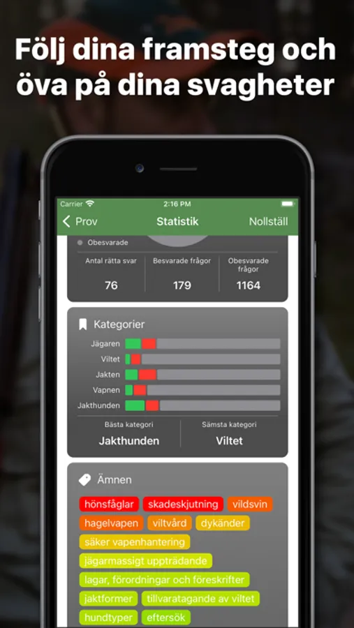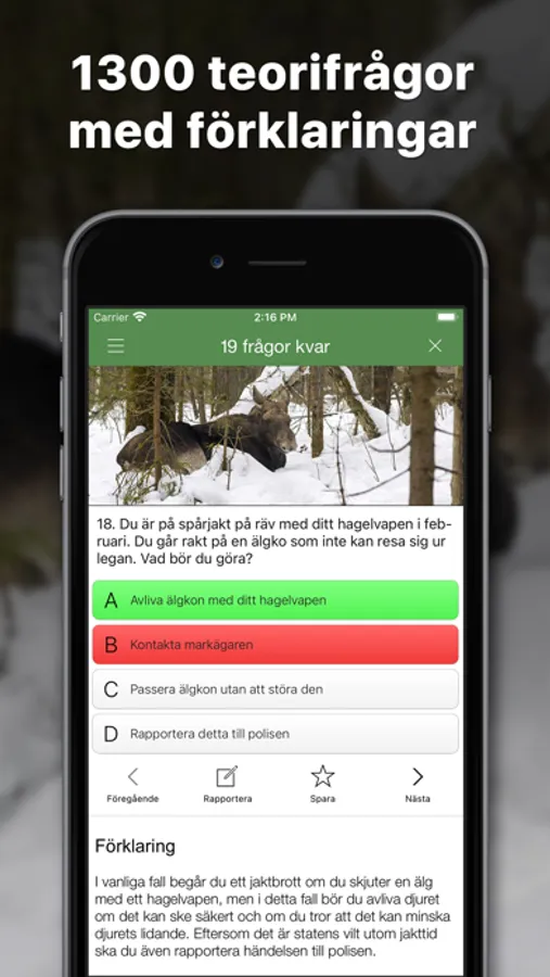 Jägarexamen innehåller också sex olika typer av prov: smarta övningsprov som anpassar sig efter din kunskapsnivå, viltprov, ämnesprov, fågelprov med enbart fågelbilder, realistiska teoriprov och egna prov där du själv väljer alla inställningar. I vår frågedatabas finns över 1 300 teorifrågor som är väldigt lika frågorna på det riktiga provet. För att all ny kunskap ska sätta sig på djupet så har alla frågor tydliga förklaringar som snabbt hjälper dig att förstå även de svåraste frågorna.