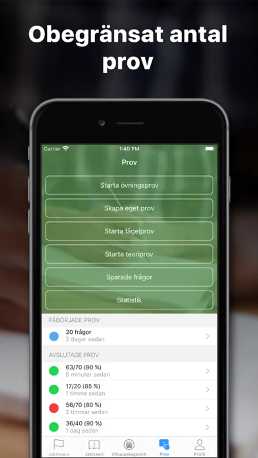 • Sex olika typer av prov: smarta övningsprov, viltprov för varje viltkategori, ämnesprov, fågelprov med enbart fågelbilder, realistiska teoriprov och egna prov där du själv väljer alla inställningar.