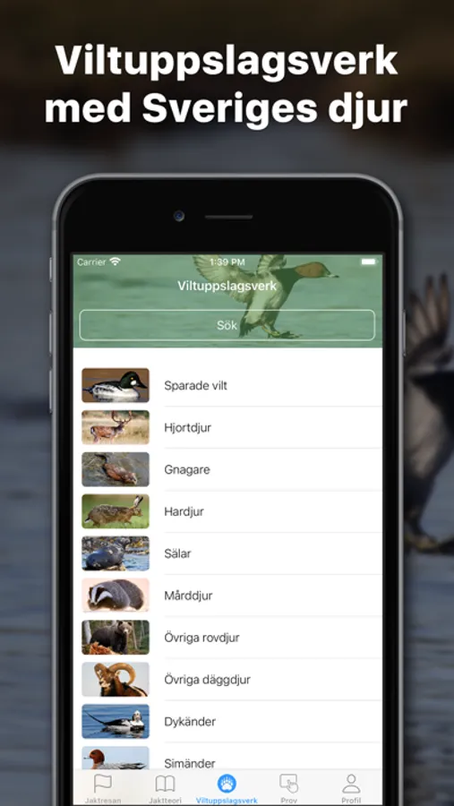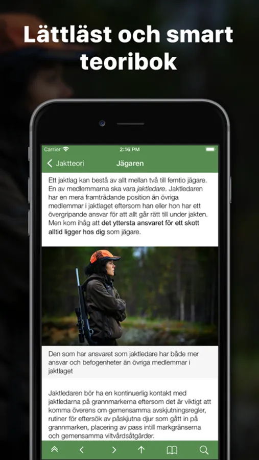 I appen finns även en sökbar och lättläst teoribok som sammanfattar hela jaktteorin, en videogrundkurs i säker vapenhantering och skytte, en checklista som guidar dig genom alla stegen fram till din jägarexamen, detaljerad provstatistik som visar dina framsteg inom 50 olika ämnen och ett uppslagsverk med alla Sveriges vilt med massor av bilder och videor!
