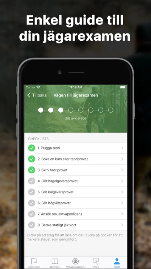 • Checklista som guidar dig genom alla stegen fram till din jägarexamen.