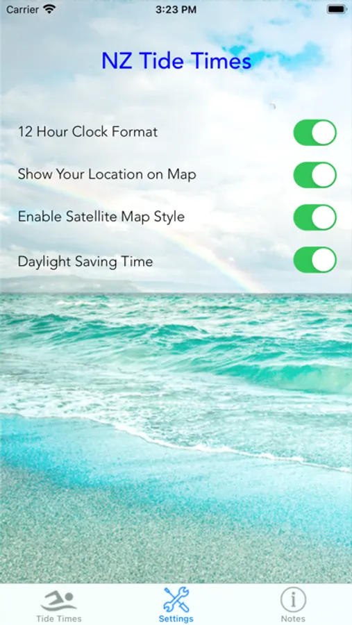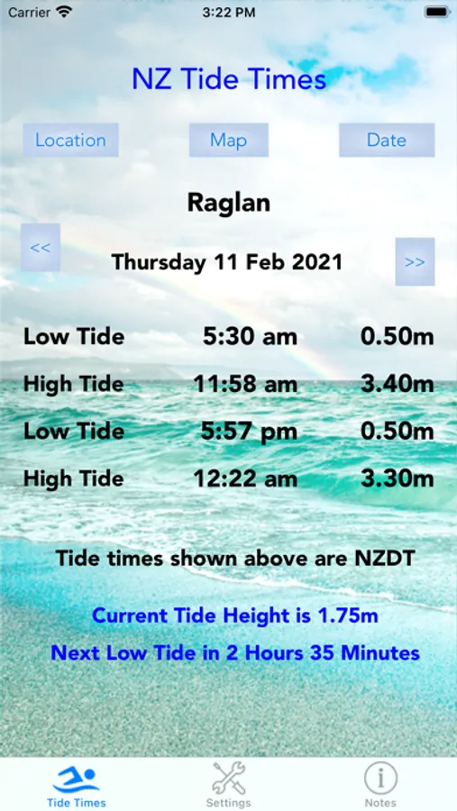 New Zealand Tide Information. Use your devices GPS to show your location or pick yourself from 250 locations around New Zealand. No Internet Access is required for the lookups on the tide tables however the GPS Maps do require a data connection. So, if you are sitting on a beach you can still display the high and low tide information. You can display the current date, or any date into the future right through to December 2023. Daylight Saving Times are calculated. Also shown are the current tide heights and the time to the next tide. Major ports included are Auckland, Bluff, Lyttelton, Marsden Point, Napier, Nelson, Onehunga, Picton, Port Chalmers, Port Taranaki, Tauranga, Timaru, Wellington and Westport.