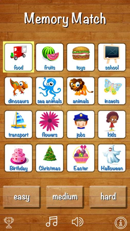Memory Match HD is an interactive, adaptive and fun memory game for children of all ages. It's a perfect way to engage children in a fun game while they exercise their memory – play and learn at the same time! Simply tap two cards to flip and match a pair.