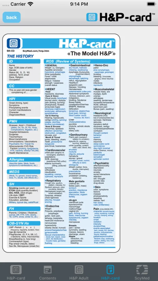 The H&P-card™ has been the classical, must-have, pocket reference for the H&P for more than 25 years. This brand new App is intended as an efficient, Point of Care reminder of the H&P elements, sequence and processes. It emphasizes the innovative "Specific H&P™" concept and includes several H&P templates with brief and complete formats.