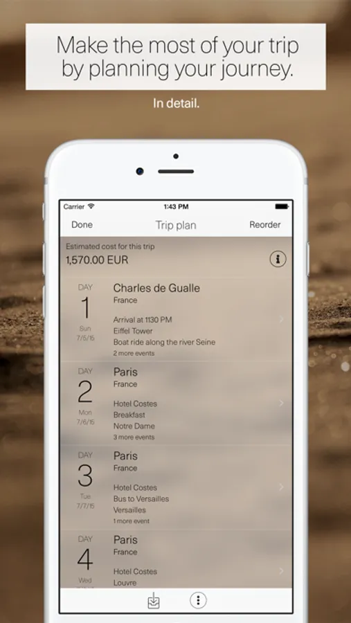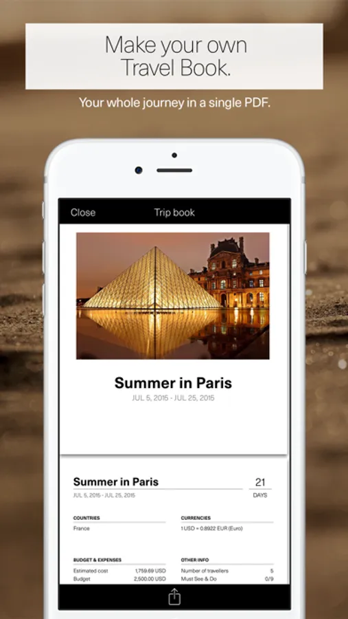 Make a daily itinerary, safely store your documents and tickets confirmations, plan your budget, create a packing list, track your expenses and more.