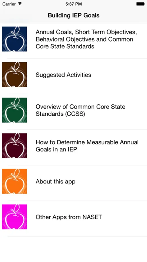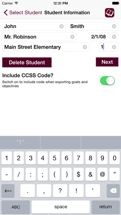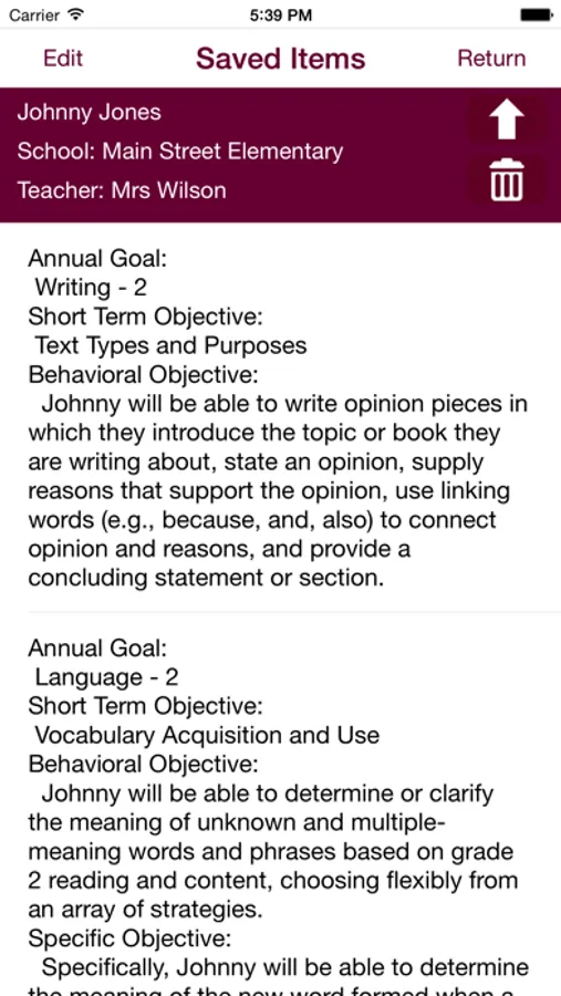 This application allows you to easily build a list of students, and for each one, choose & build a list of IEP Annual Goals, Short Term Objectives, and Behavioral Objectives that include Common Core State Standards (CCSS). For each objective, you are provided with the option to add a Mastery Level. The output of each student's list of Goals and Objectives can then be sent by email or text message.