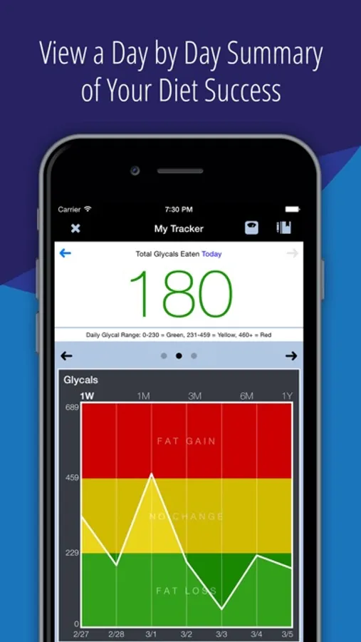 Glycal Tracking – Calculates customized maximum daily glycal ranges based on your age, gender, height, weight and hours of sleep. Graphs daily glycals so you can monitor your progress visually.