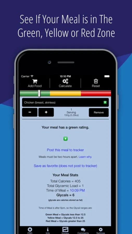 You assemble a meal by choosing the individual foods in that meal. The app then calculates the total number of glycals in that meal and gives you a green, yellow or red result.