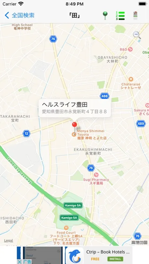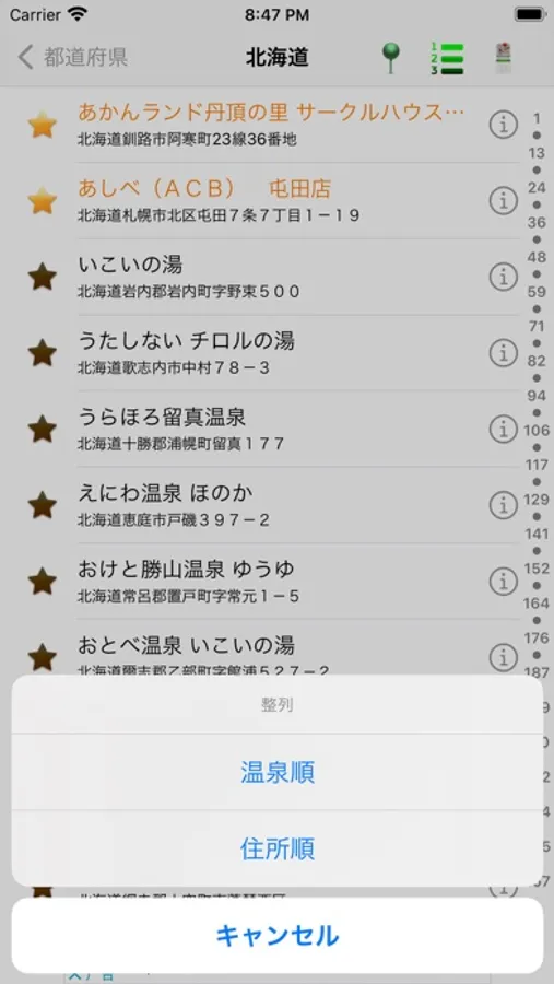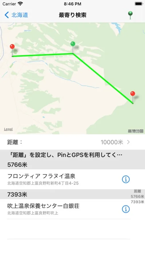 その上、全国温泉検索、都道府県内検索、気に入り情報管理、最寄り温泉(指定範囲のすべての温泉)検索などの機能も付きます。特に、画面の「地図のみ」、「テ-