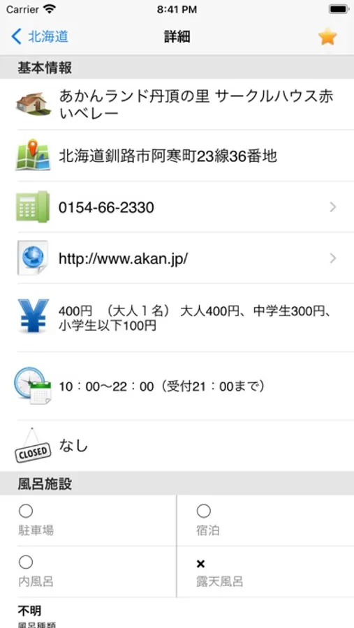 温泉についての温泉住所、電話(iPhoneなら直接かける)、ホームページ、料金、営業時間、休日、駐車場、内風呂、露天風呂、休憩所、食事処、マッサージ-