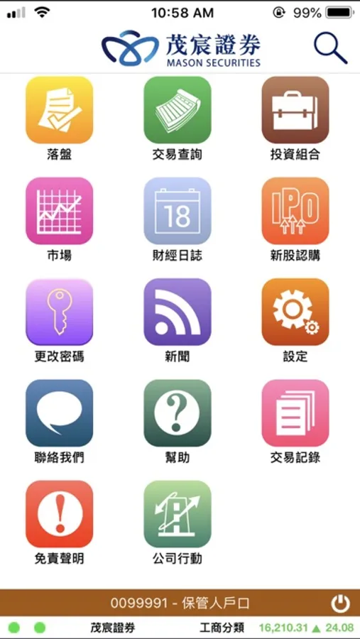 Mason Securities Mobile is an iPhone online trading platform (茂宸證券掌中寶) of Mason Securities that can be downloaded from Apple App Store. Using this application, customers can place orders, check order statuses, transaction history, account and stock balances. Mason Securities Mobile can also provide market information including rankings and indices.