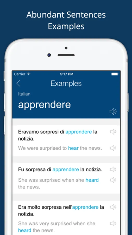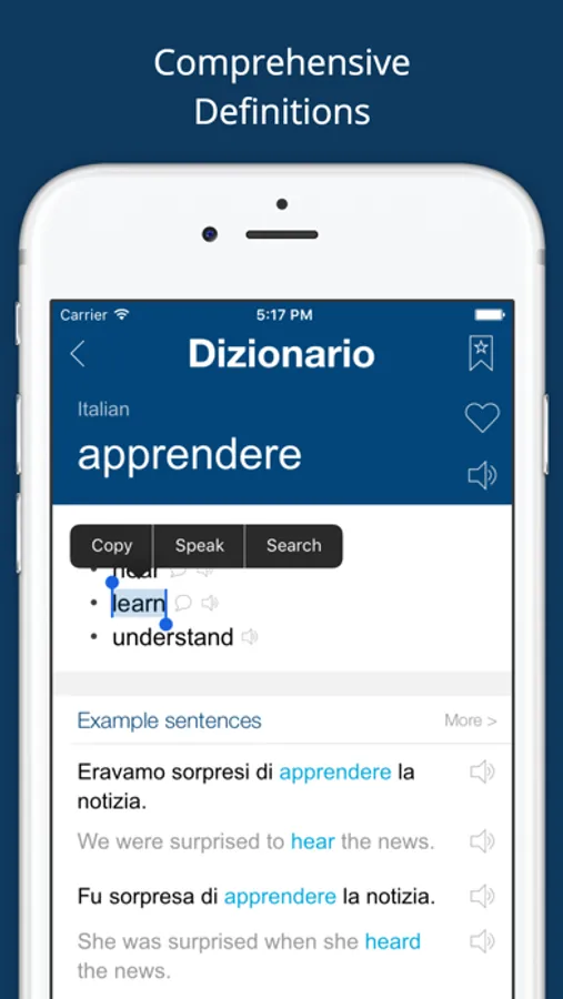 The Italian English Dictionary & Translator app enables you to search Italian & English words with definitions, examples, pronunciation, and more.