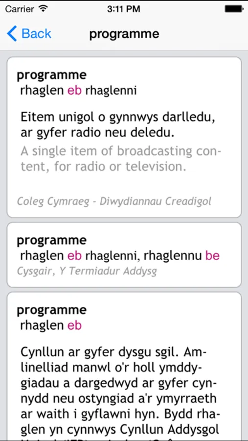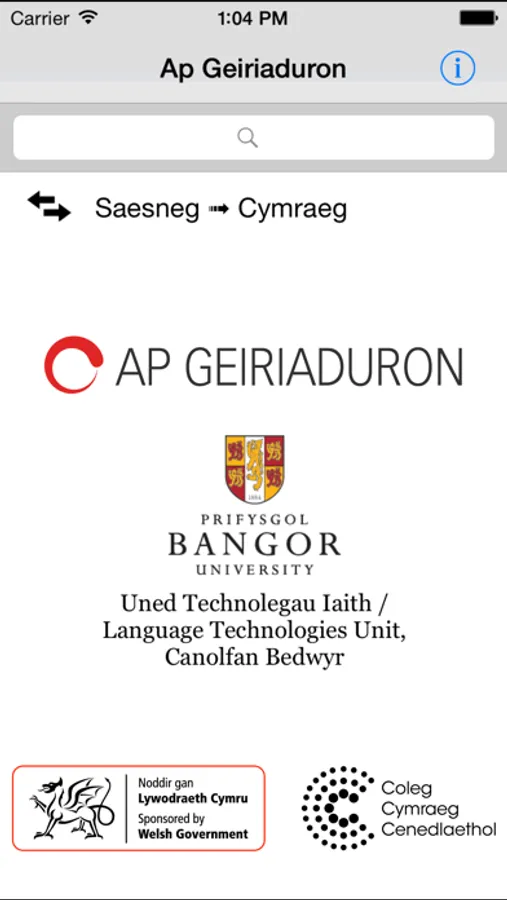 The Ap Geiriaduron contains the Cysgair general dictionary, as well as the standardised terminology dictionaries for schools and further education colleges in Wales, Y Termiadur Addysg, and for Universities in Wales, Geiradur Termau’r Coleg Cymraeg Cenedlaethol. All these dictionaries provide English-Welsh/Welsh-English entries and can be used offline in case you do not have an internet connection.