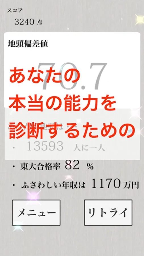 - 地頭力から偏差値を算出し、東大合格率や適正年収を診断します