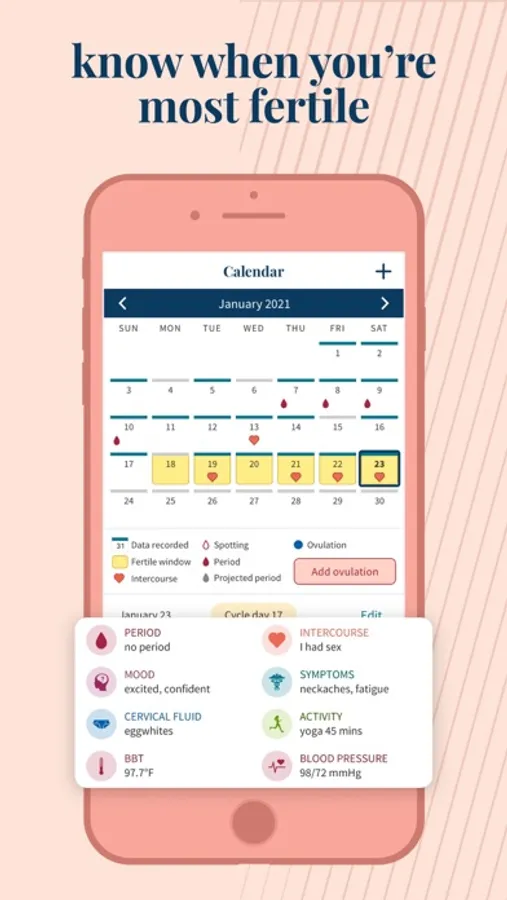 ◆ Track your basal body temperature, cervical fluid and position, medications, and more in your app calendar.