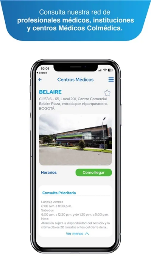 •Directorio médico, a través de la cual puede consultar nuestra amplia red de profesionales médicos e instituciones tanto clínicas como diagnósticas y los Centros Médicos Colmédica. Esta funcionalidad le permite realizar de manera ágil, oportuna y detallada búsquedas por tipo de plan, ciudad, Centros Médicos Colmédica, especialidad y profesionales médicos adscritos a la red.