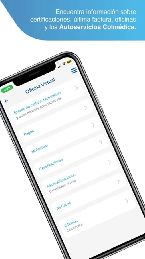 •Oficina virtual, en esta sección puede encontrar información sobre certificaciones, última factura, oficinas así como de los Autoservicios Colmédica.