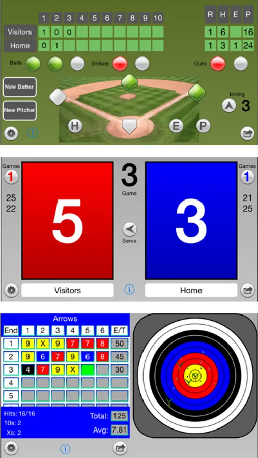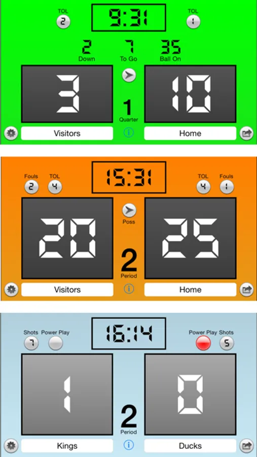 Switch between Volleyball, Basketball, Football, Archery, Hockey, Lacrosse, Baseball, and Table Tennis. One default scoreboard of choice is free. An In-App purchase is available to disable Ads and give access to all scoreboards.