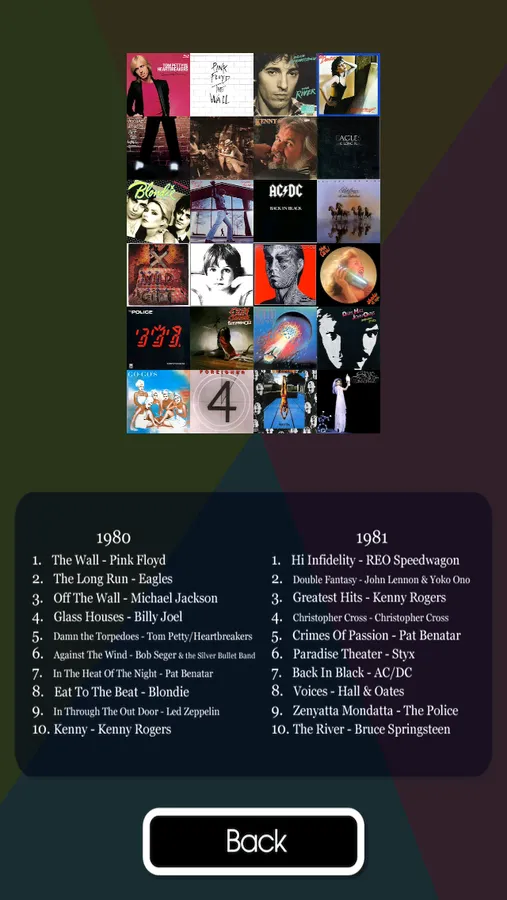 Score high and unlock the Unlockables - Top ten album countdown of each decade together with collage of album covers.