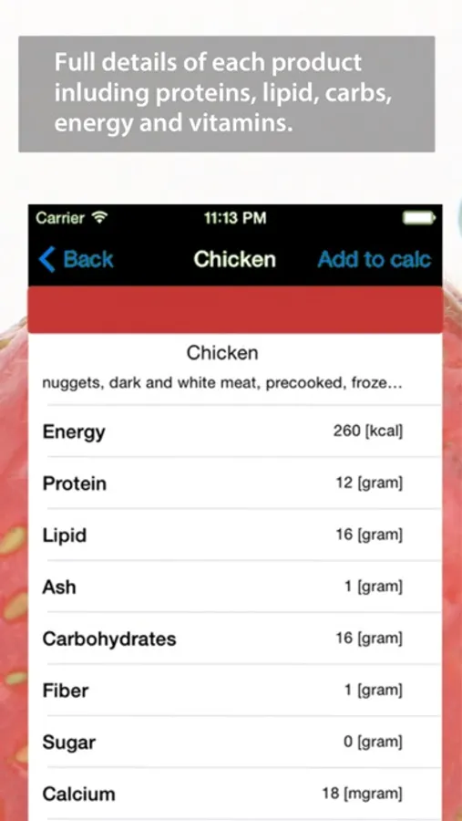 - detailed information about each product (energy, protein, carbs, lipid, vitamins...)