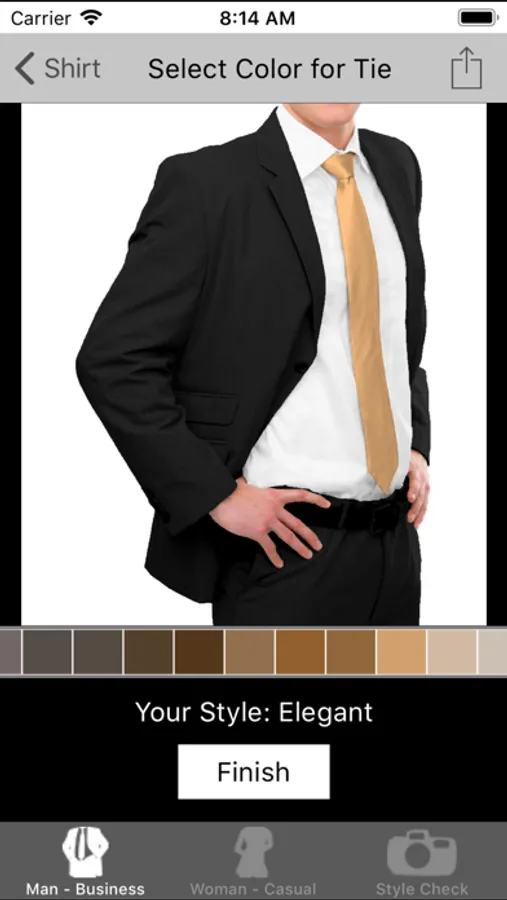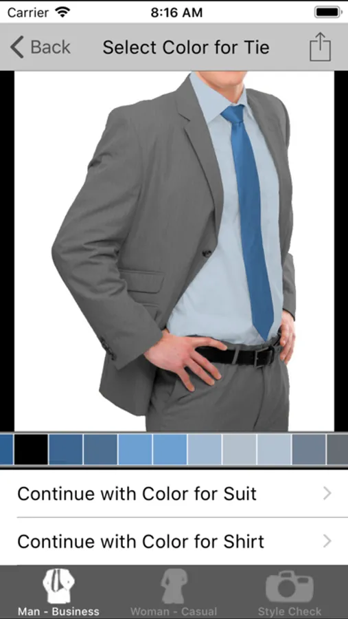 Choose a color for your shirt and you will get suitable colors for your tie. You can find matches in any order. For example, start with the suit, than the shirt and select the tie color at the end. Or start with the shirt or the tie. For any order the app always shows you nothing but the suitable colors.