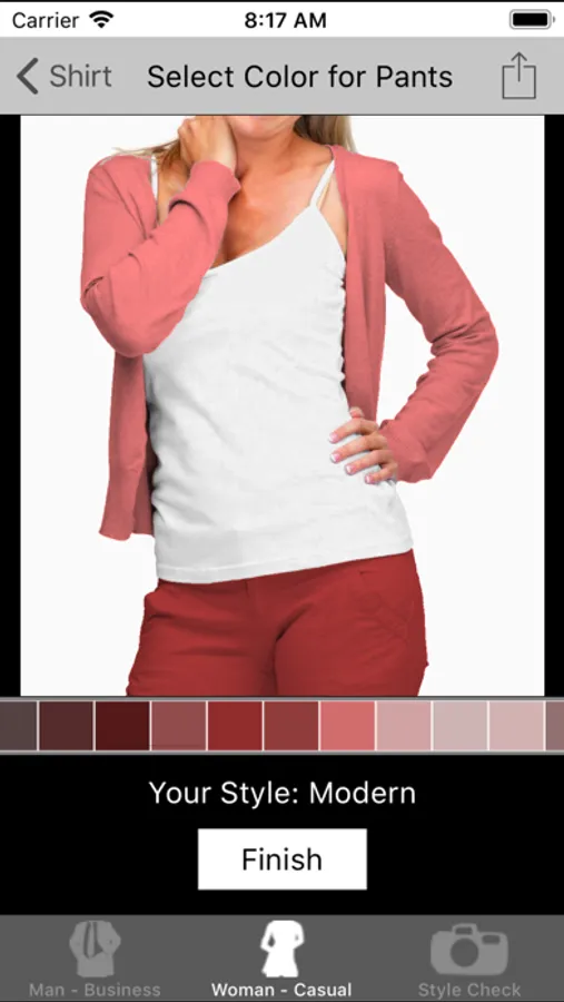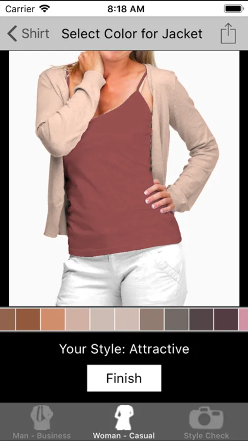 As soon as you click on a color the pieces of clothes change their appearance. Choose between different pictures for business clothes, casual, etc. Get new pictures free with app updates.