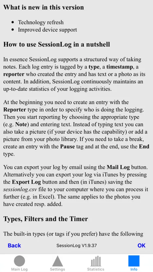 Each log entry has a tag, a timestamp and some text you enter or a picture from your library or device. You can add your own tags and the tags can be used for filtering the log entries.