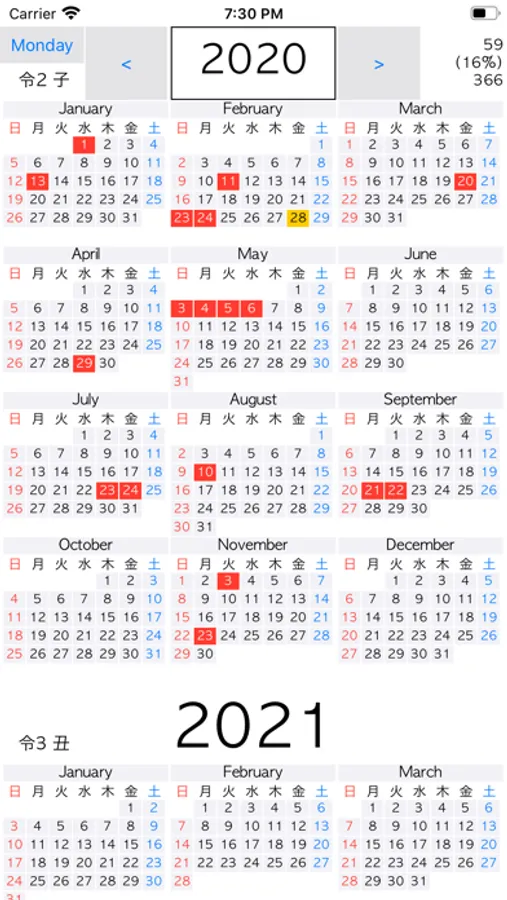 Perpetual calendar to display this year and next year every year. The calendar display this year and next year every year. Switch in the Sunday or Monday the first day of the week. Switch the year in left and right buttons and swipe. Displays the number of days elapsed this year. Displays the percentage of days elapsed this year. Notification Center and Badge App Icon. Zoom-in and zoom-out.