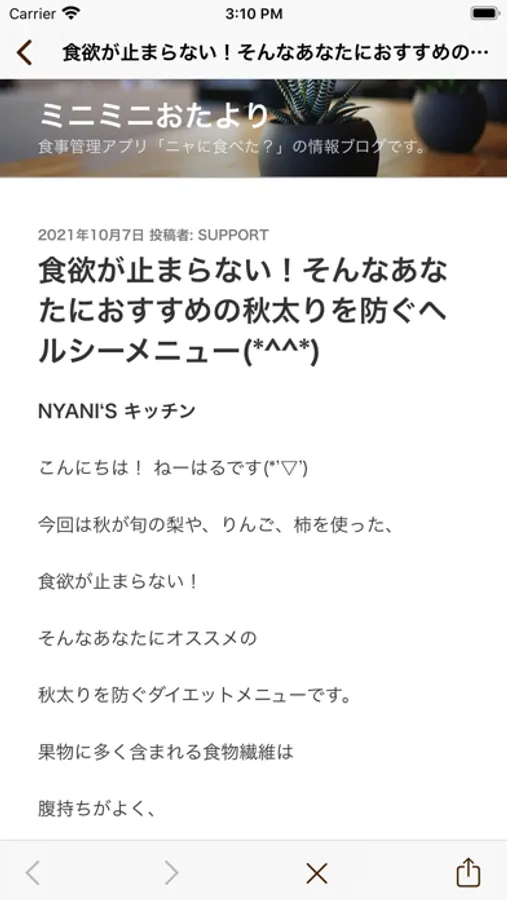 You can compare your whole diet in a day with the Japanese food guide after registering your age and weight etc. This application is to support your health. The black cat of this application’s character named ‘Nyani-chan” supports your health quietly, too. Please enjoy it!
