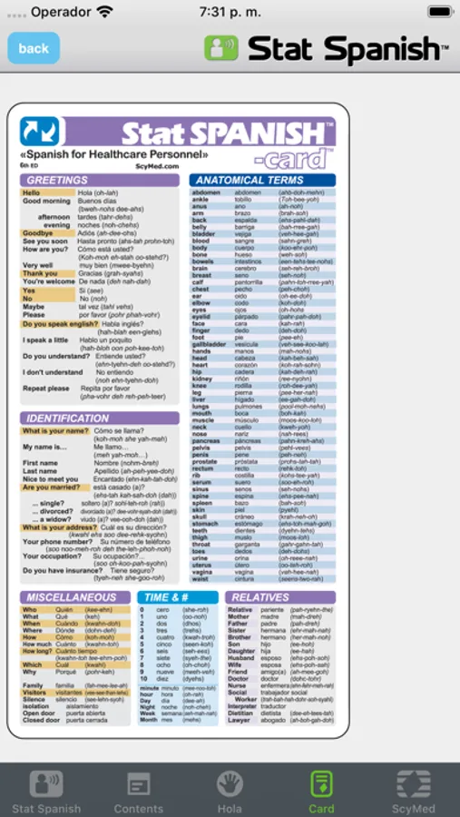 The Stat Spanish™ is an efficient translation resource, not an english-spanish dictionary, it includes the context-oriented, commonly used, words and phrases needed in the medical office and Hospital settings.