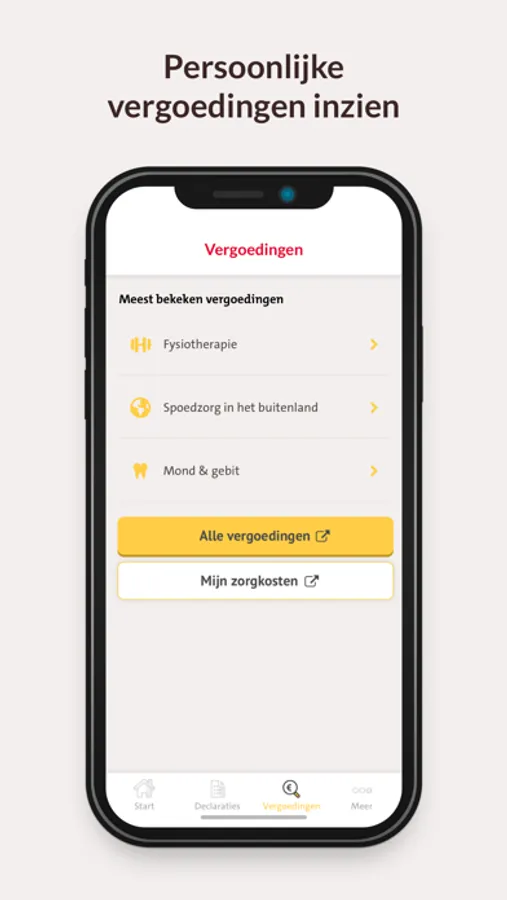 • Bekijk in de app hoe je verzekerd bent voor de meest bekeken vergoedingen. Bijvoorbeeld voor fysio of alternatieve zorg