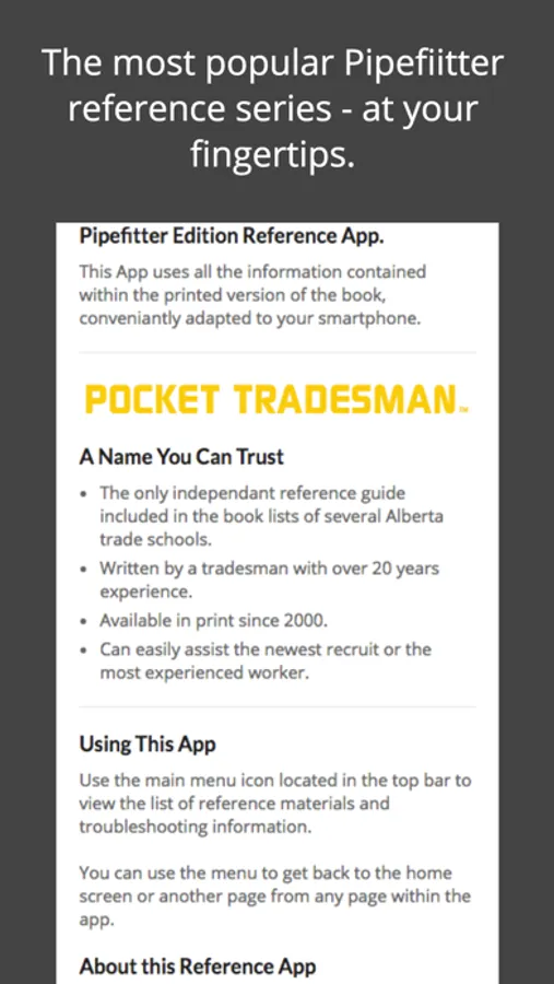Pocket Tradesman™ Pipefitter Edition is a quick and handy reference app. It can easily assist the newest recruit or the most experienced worker by providing important information and helpful reference tools that are needed and used by trades people every day on the job.