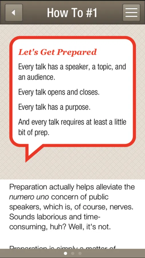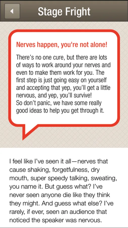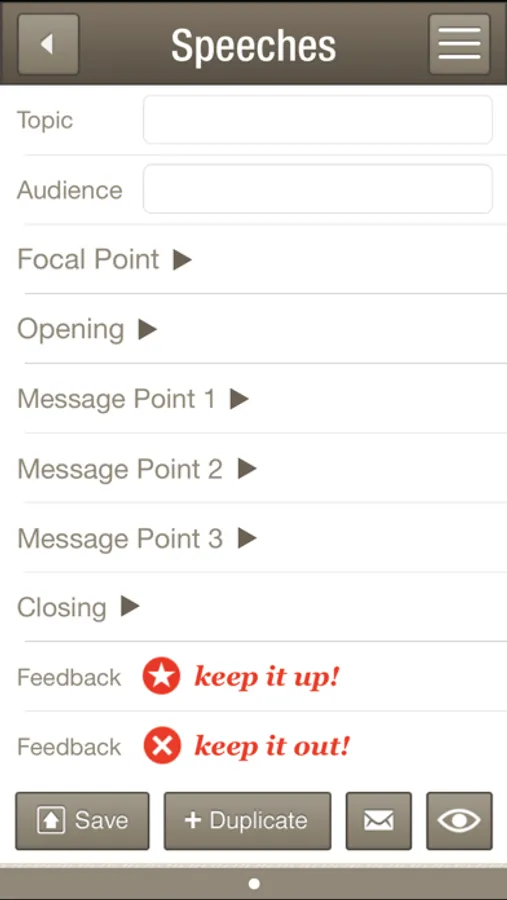 The app leverages technology to bring SmartMouth’s proprietary public speaking methodology to more people than SmartMouth, or any consultancy, could possibly reach through its coaching and training practice. In addition to the “How To” content that walks users through the parts of a speech, this app also offers “Journal” entry space for notes to self, which might include a personal introduction, ideas for future topics, observations of other speakers, or stories and anecdotes. The big functionality attraction is the speechwriting tool. In the "Speeches" section, users follow prompts to create a detailed outline for a speech or presentation. Once the outline is created in the app, it can be saved (archived for future reference), duplicated (and adapted for another talk), and/or emailed (so the user can work on it or add visuals from their desktop or laptop). There is space to store feedback – e.g. what worked and what didn't work – for each speech or presentation.