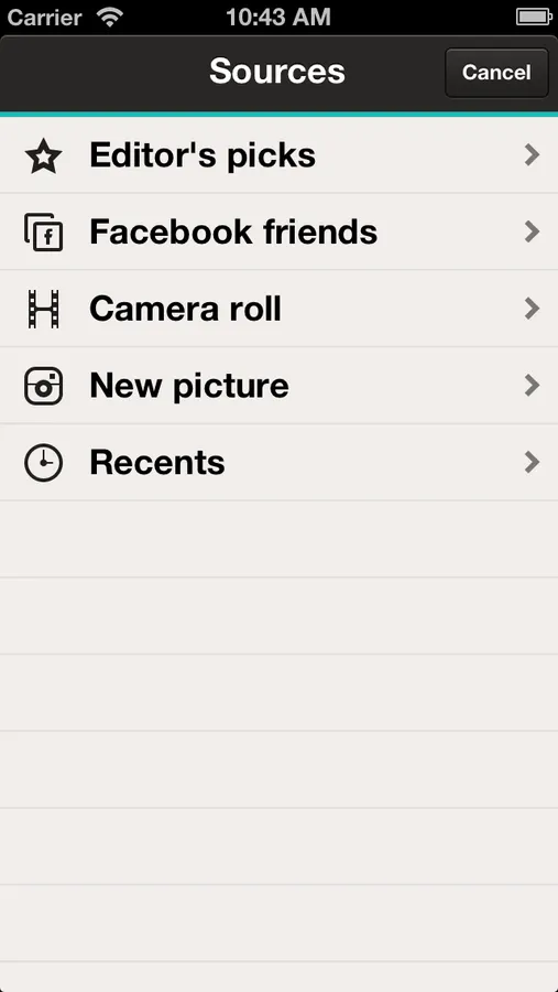 Surprise your friends! Select pictures from your camera roll, from photos of Facebook friends, or from our own collection (Applidium's picks) and share the result!