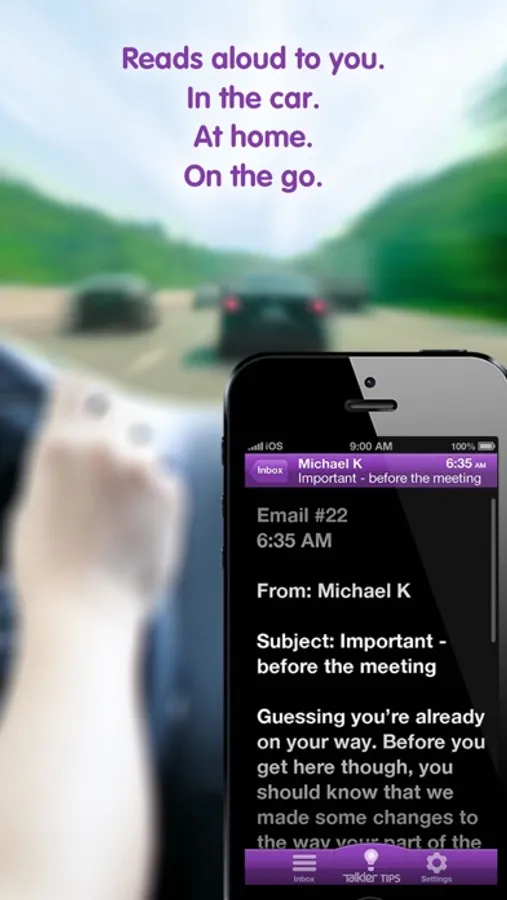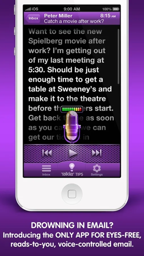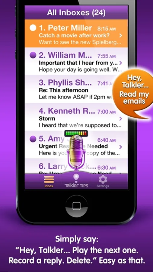 DROWNING IN EMAIL? Introducing Talkler — the ONLY APP FOR EYES-FREE, reads-to-you, voice-controlled email. Complete control of your inbox: Listen, Delete, Mark Unread, Reply, and much more. Heads-up Productivity + Safety — in the car, at home, on the go. Reads your emails aloud. Listens for your voice commands. EMAIL FOR YOUR EARS!