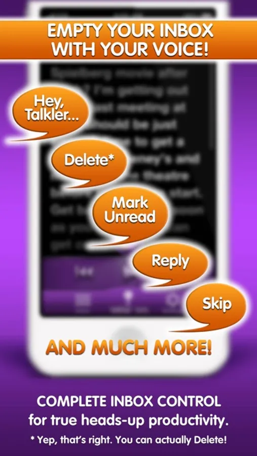 *Yes, it's true! You can actually Delete and Mark Unread — and much more — just by speaking into the air. (Isn't that what you've been asking for?) Only Talkler offers true inbox management — all the commands you need to achieve INBOX ZERO... EYES-FREE!