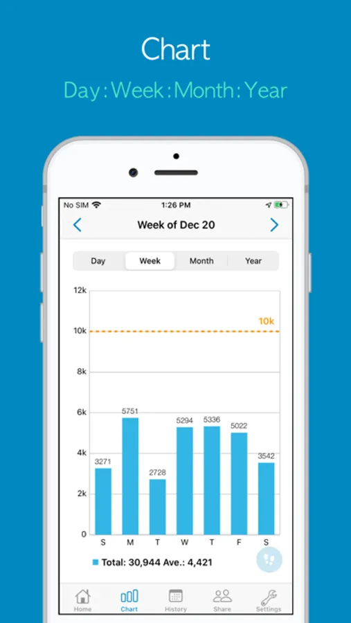 • Charts: Daily, weekly, monthly, and yearly step counts.