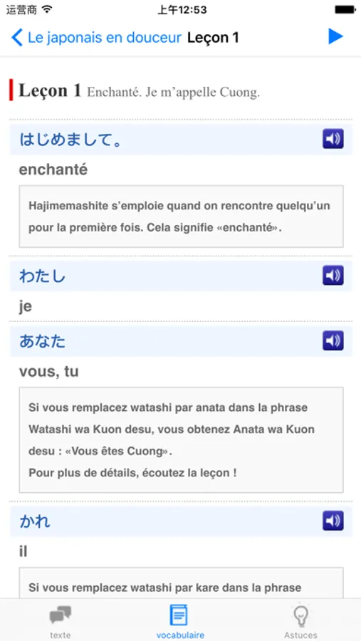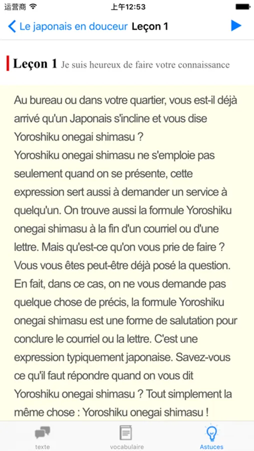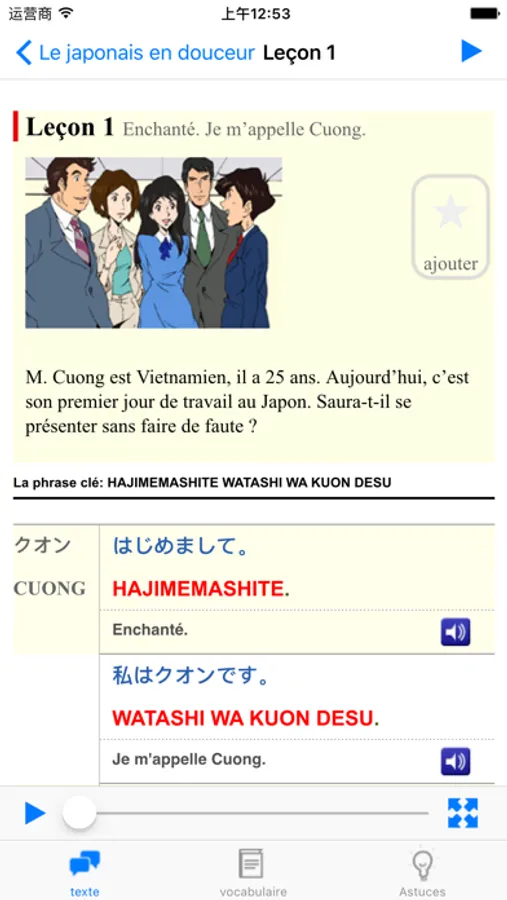 Dans chaque leçon, vous pourrez apprendre une expression pratique présentée dans un sketch audio. A la fin de la série de leçons, vous maîtriserez 50 expressions utiles !