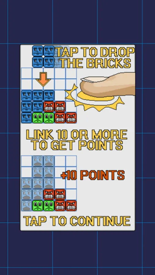 Fall Bricks is a one-button puzzle game. Tap to place bricks and make sets of 10 to get points and clear blocks from the screen. The game gets faster as you earn points. Try to get the high score!
