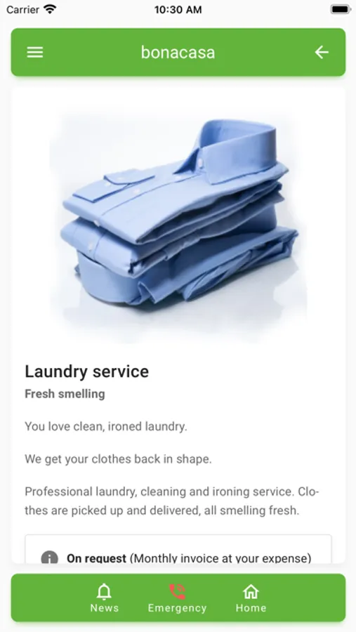 Whether it's cleaning, laundry service, driving services, delivery service or individual concierge requests: with the bonacasa app, you can book living services simply and easily and quickly receive help in the event of an emergency for more comfort and safety in your own four walls thanks to the integrated emergency call button.