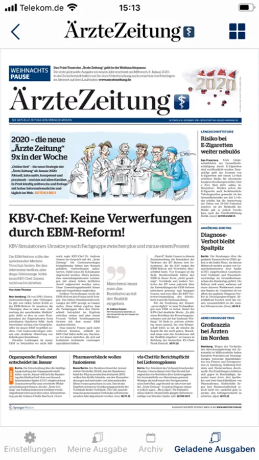 Aktuelles Wissen kompakt für Ärzte: „Ärzte Zeitung Digital“ bietet Nachrichten, Kommentare und Hintergründe zu Medizin, Gesundheitspolitik und wirtschaftlichen Themen rund um die Praxis. Die App bietet dabei sowohl den Komfort, die Printausgaben der „Ärzte Zeitung“ – der aktuellen Zeitung von Springer Medizin – und weitere Fachausgaben (Klinik-Report, Neurologen und Psychiater, Onkologen und Hämatologen sowie Rheumatologen) als e-Paper zu lesen als auch die Newsfunktion der Website zu nutzen.