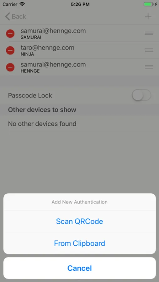 HENNGE OTP Generator supports multiple authentication source. You may use QR codes, or URLs copied onto the clipboard to add authentication config.