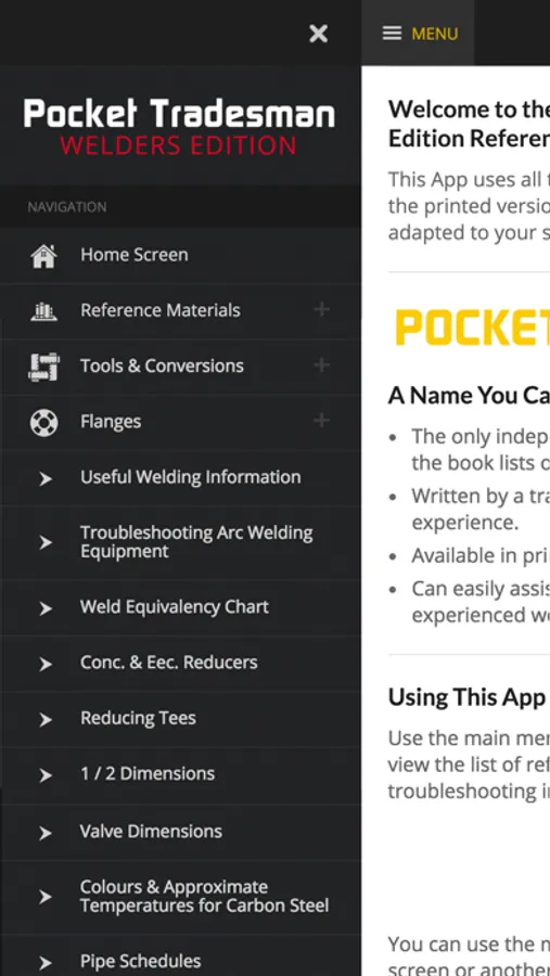 Pocket Tradesman™ Welder Edition is a quick and handy reference app. It can easily assist the newest recruit or the most experienced worker by providing important information and helpful reference tools that are needed and used by trades people every day on the job.