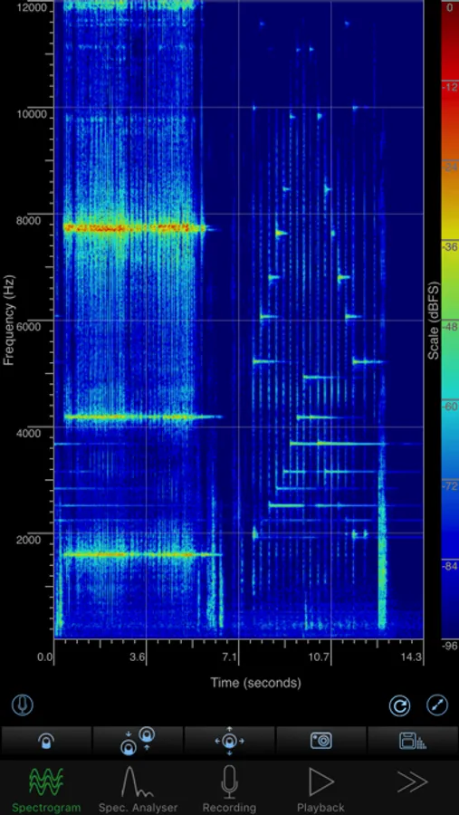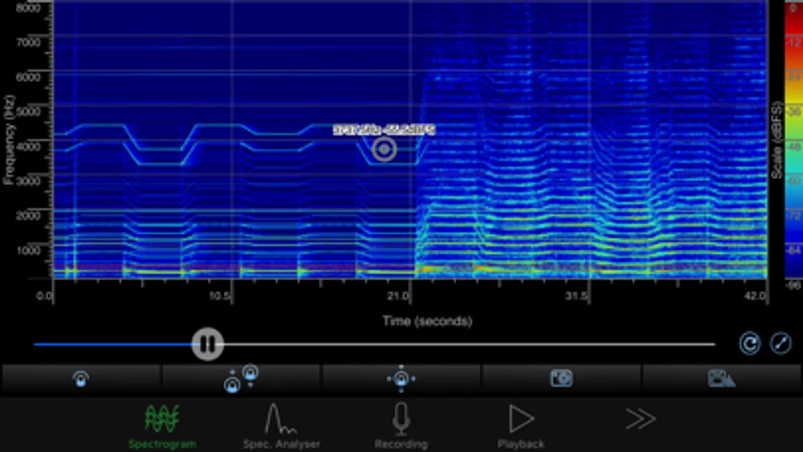 Visualise, in real time, the frequencies that you can hear around you and even those you cannot. SpectrumView provides a high-quality, real-time spectrogram and spectrum analyser display, with a configurable sample rate and frequency resolution for the iPhone, iPad and iPod Touch. You can use this application to measure the highest tones you can sing, obtain visual feedback of the frequencies in your speech, identify an annoying sound, calibrate musical instruments and all sorts of acoustic analysis.